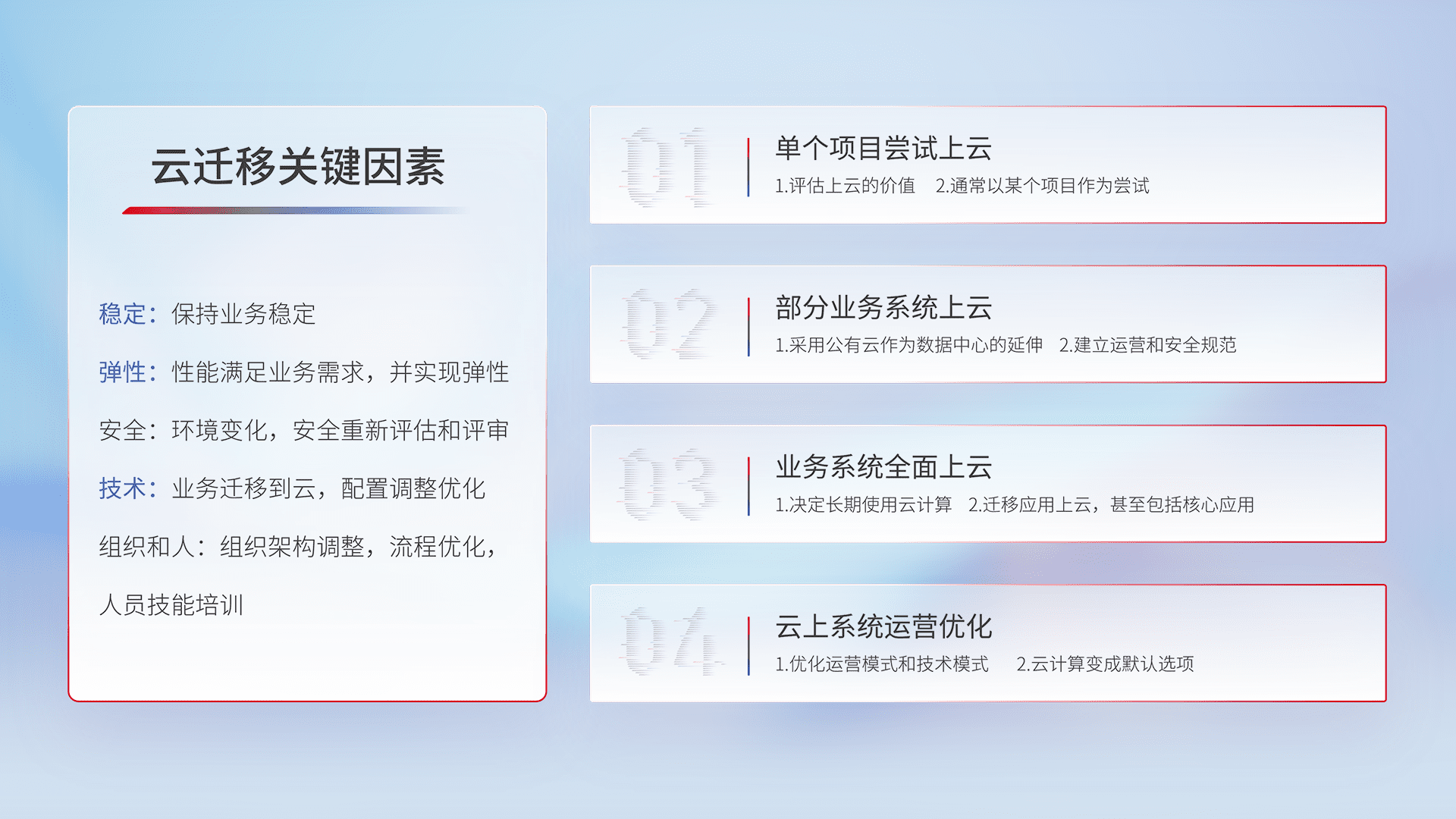 结合实际业务,,,从规划设计、、、、云平台选型、、、云原生改造、、数据迁移、、、、集成交付,,迁移全过程为客户识别最佳上云路径,,,,做好风险识别管理,,,,设计网络架构、、、、身份权限、、、、安全审计合规、、操作审计、、、、日志审计、、监控告警策略、、、、多站点容灾设计等,,,对云上基础设施进行整体规划,,,,提升IT治理水平,,,以满足弹性、、、、高可用、、、高性能的需求。。