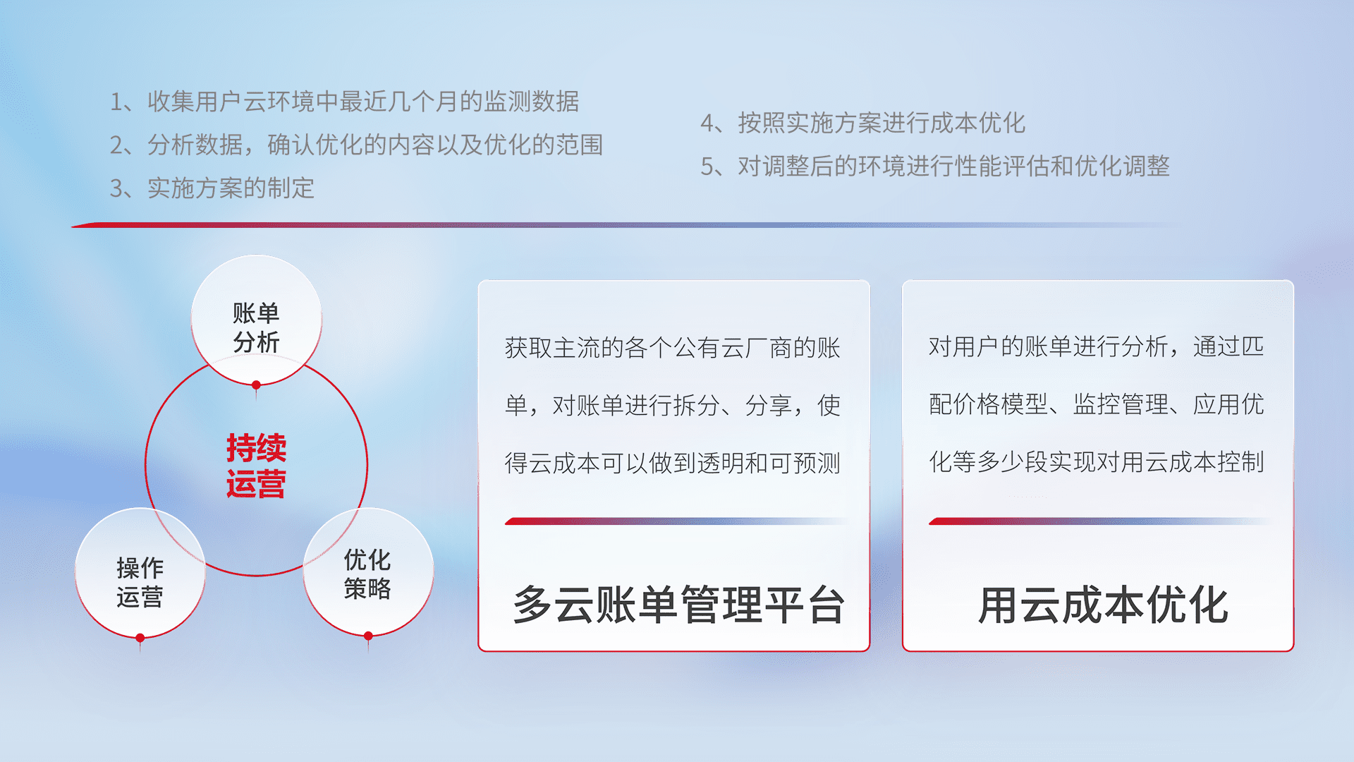 通过多云纳管,,以统一的资源数据模型把客户的云资源进行抽象和封装,,进而实现对多云资源的统一操作,,保障云资源管理的可靠性、、、稳定性与可用性。。。。量身定制化运维内容,,配置、、、、开发运维、、补丁管理、、、备份、、、监控、、、、认证和访问管理、、、、审计和日常巡检等,,,保障在用云过程中的可靠度,,稳定度以及高可用率。。。。